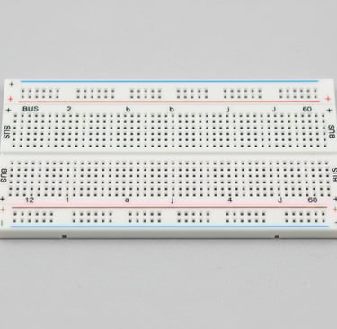 A breadboard (also called a solderless breadboard or protoboard) is a rectangular block of plastic with a grid of holes. Internally, metal spring clips connect specific holes together in rows and columns, creating electrical connections when you insert component leads or wires into the holes.